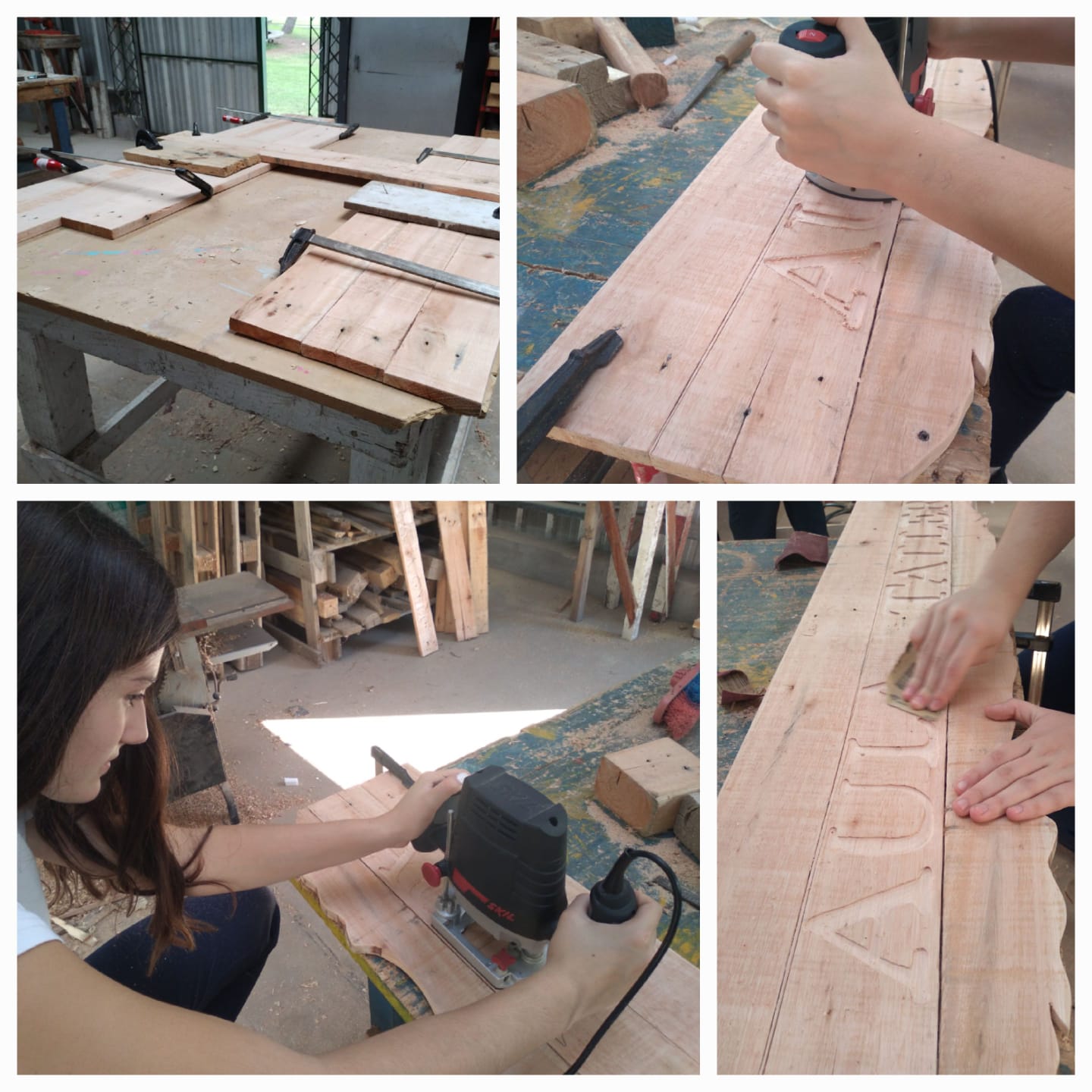 El proyecto se realizó durante todo el primer cuatrimestre pasando por cada proceso de trabajo. Las maderas de base con sus recortes, el calado y tallado de las letras, la deshidratación de las flores, el armado de la estructura y sellado para la contension de la resina, diseño de la distribución de las flores, proceso de aplicación de la resina y finalmente el pulido y pegado de las letras corpóreas.